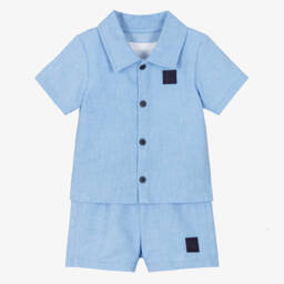 White and blue shorts set for boys by Timberland, made in soft cotton jersey. Comfortable and easy-wearing the shorts have side seam pockets and an elasticated waistband. Both pieces have the brand's iconic tree logos on the front.