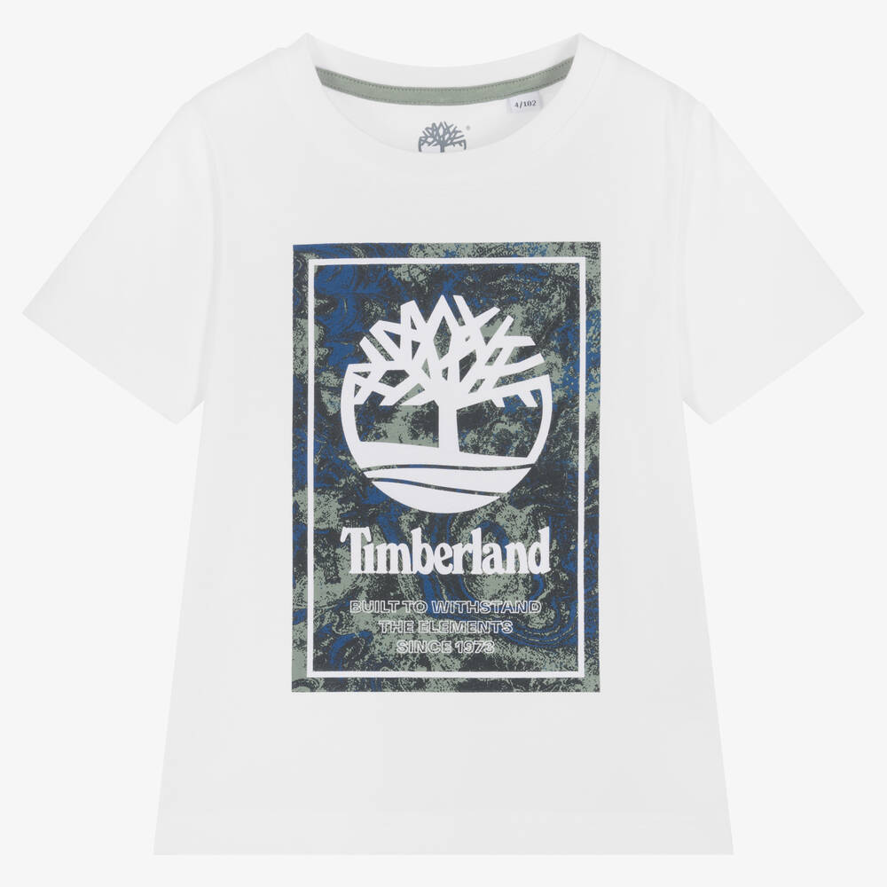 Classic white organic cotton T-shirt for boys by Timberland. The brand's iconic tree logo is printed on the front in a cool blue and green camouflage pattern.
