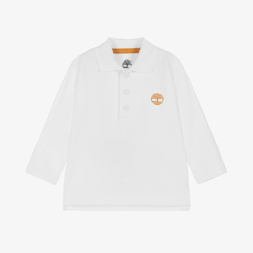 White long-sleeved polo shirt for younger boys by Timberland, with the signature tree logo printed on the front in yellow. Made in soft and comfortable organic cotton piqué, it has a ribbed collar, branded popper fastenings and vented side seams.