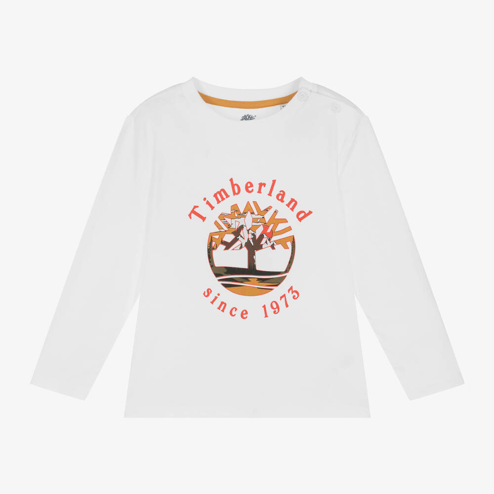 White top for younger boys by Timberland, made in soft organic cotton jersey. It has the iconic tree logo printed on the front with a cool graphic alpine design. The label's founding year, 1973, can be seen stamped below. It fastens with branded poppers on one shoulder for easy dressing.