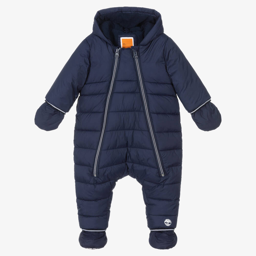Baby boys navy blue snowsuit by Timberland, with navy blue and white double front zip fastenings. Water repellent and smooth, it has warm padding with soft and cosy blue polar fleece lining. It has a white logo print on one leg and on the base of the sole printed booties. It comes with mittens and booties, detachable with poppers.
