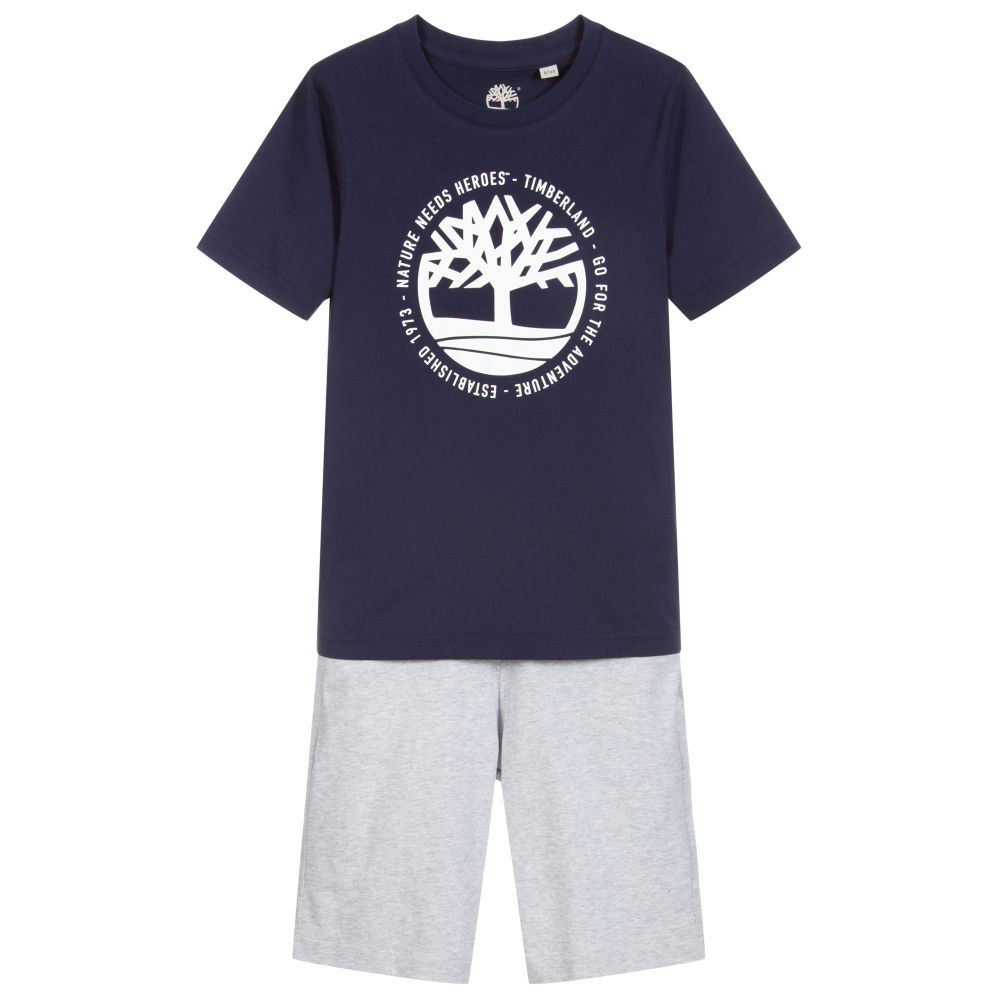 Navy blue and grey short pyjamas for boys by Timberland, made in soft and stretchy organic cotton jersey. The navy blue top has a white logo print on the front and the grey shorts have side seam pockets and a navy blue elasticated waistband with a white logo print.