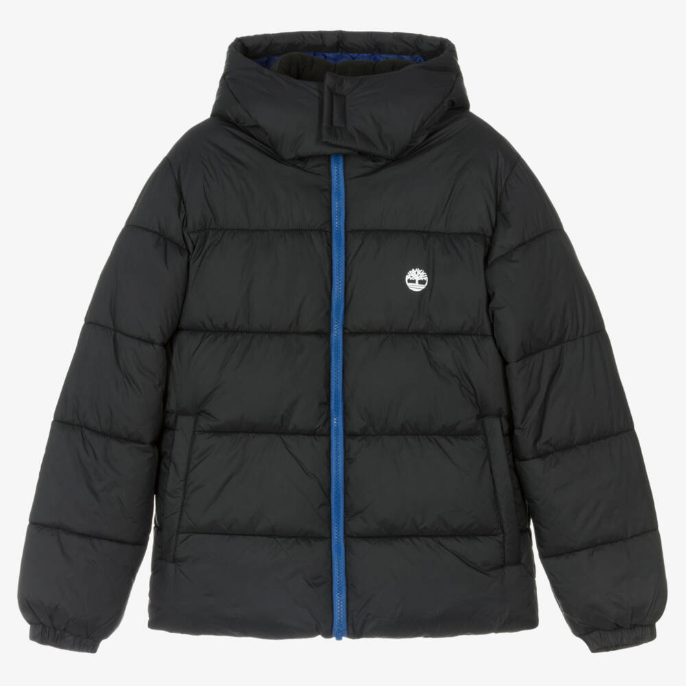 Teen boys black hooded puffer jacket by Timberland, with the label's iconic tree logo printed on the chest in white. Great for the colder months, this warmly padded layer has an exposed zip fastening, a protective chin guard, and a velcro tab on the hood. The front pockets are lined in soft and cosy fleece and the inside velcro pocket is handy for storing essentials safely. It is made in a silky smooth water-repellent fabric with a silky logo-branded lining. This item contains recycled fabric.