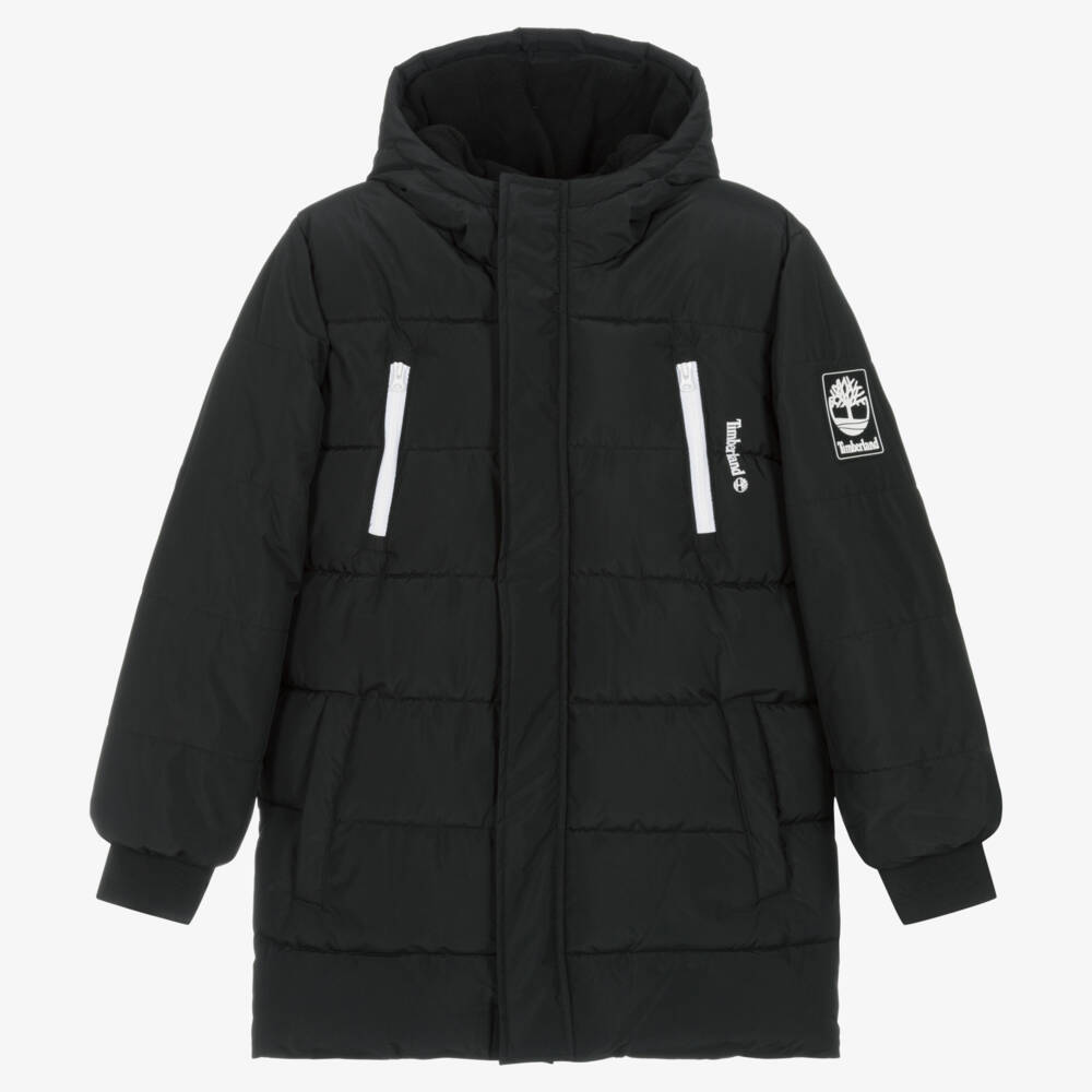 A black hooded puffer coat for teen boys by Timberland, with a signature motif and a rubberised logo badge. Functional yet modern, this water-repellent coat has fleece-lined zip-up pockets and side seam pockets. The bodice is fleece-lined and has an internal concealed pocket. It fastens easily with a zip and has a velcro placket for added protection against the elements.