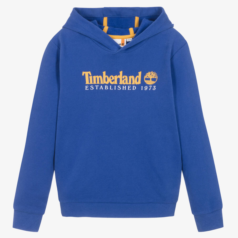 Casual blue hoodie for teen boys by American brand Timberland, with a bold orange and white logo print across the front for a distinctive designer look. Made in comfortable jersey for laid back days, it has a warm, fleecy inside and cosy ribbed trims, with useful concealed side seam pockets, trimmed in coordinating orange.