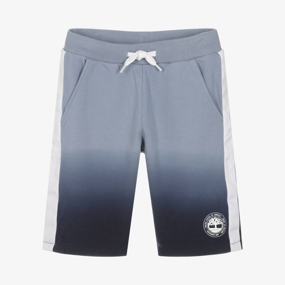 Cool blue shorts for teen boys by Timberland, in an ombré design. Made from soft mid-weight cotton jersey, these casual bottoms have the brand's signature tree logo printed above the hem in white and coordinating grosgrain stripes on the legs. In a classic style, they have slanted pockets on the hips and an adjustable drawstring waist.