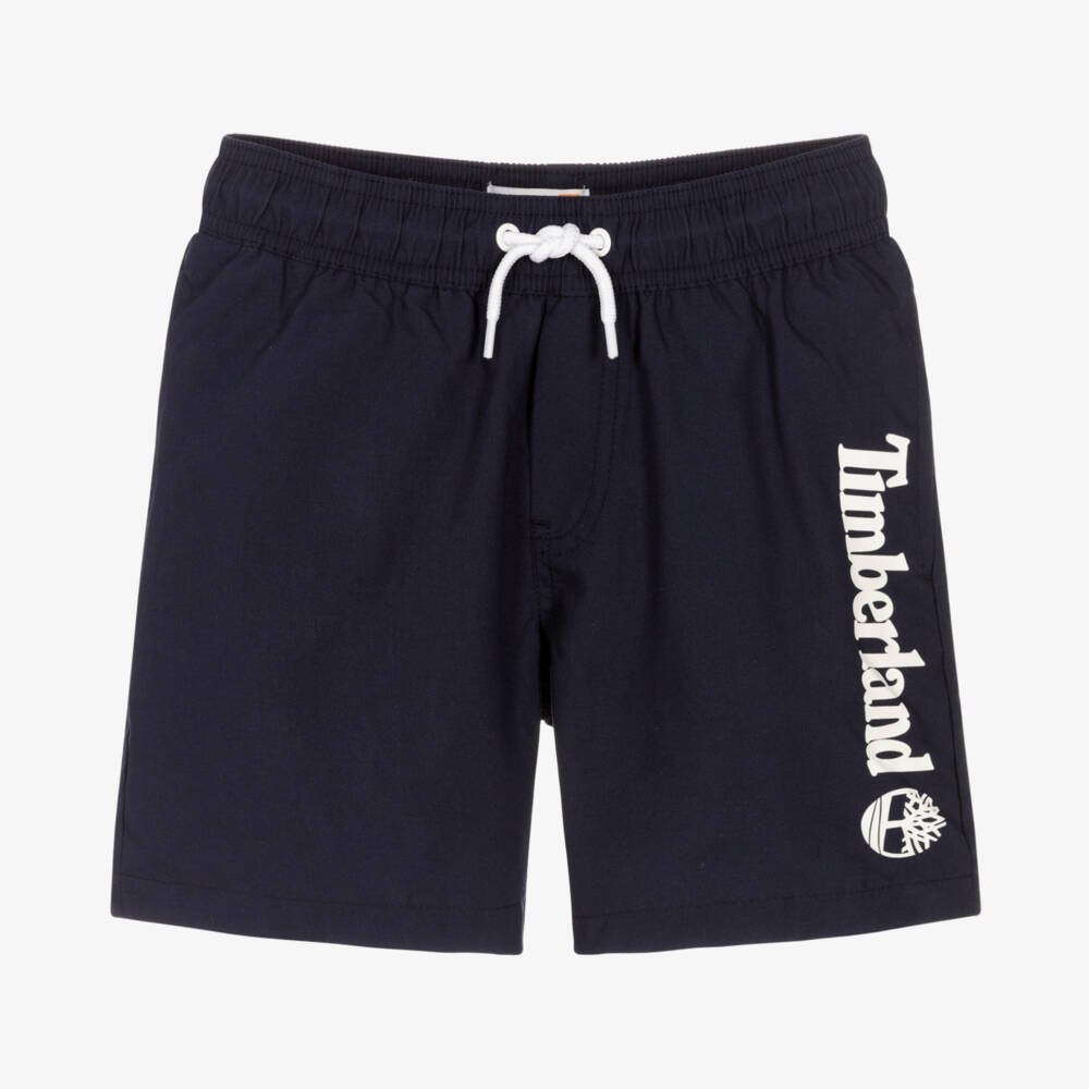 Navy blue swim shorts for teen boys by Timberland, complete with a white logo print on one leg. Lined with mesh for comfort, your teen will look cool by the pool in this eye-catching style. They have a comfortable drawstring waist and side pockets for poolside essentials.