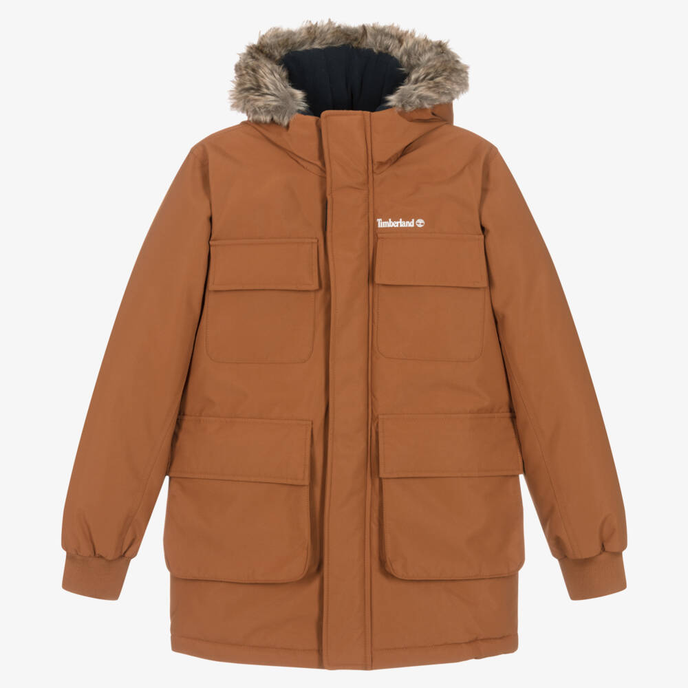 A brown padded parka coat for teen boys by Timberland, with flap-over pockets and a signature white logo on the chest. Designed to protect in cold weather, this durable canvas coat has a water-repellent exterior, with a fleece-lined bodice and hood. The hood is finished with a fixed faux fur trim, which folds onto the front with poppers for warmth. This coat fastens with a zip and has a velcro placket.