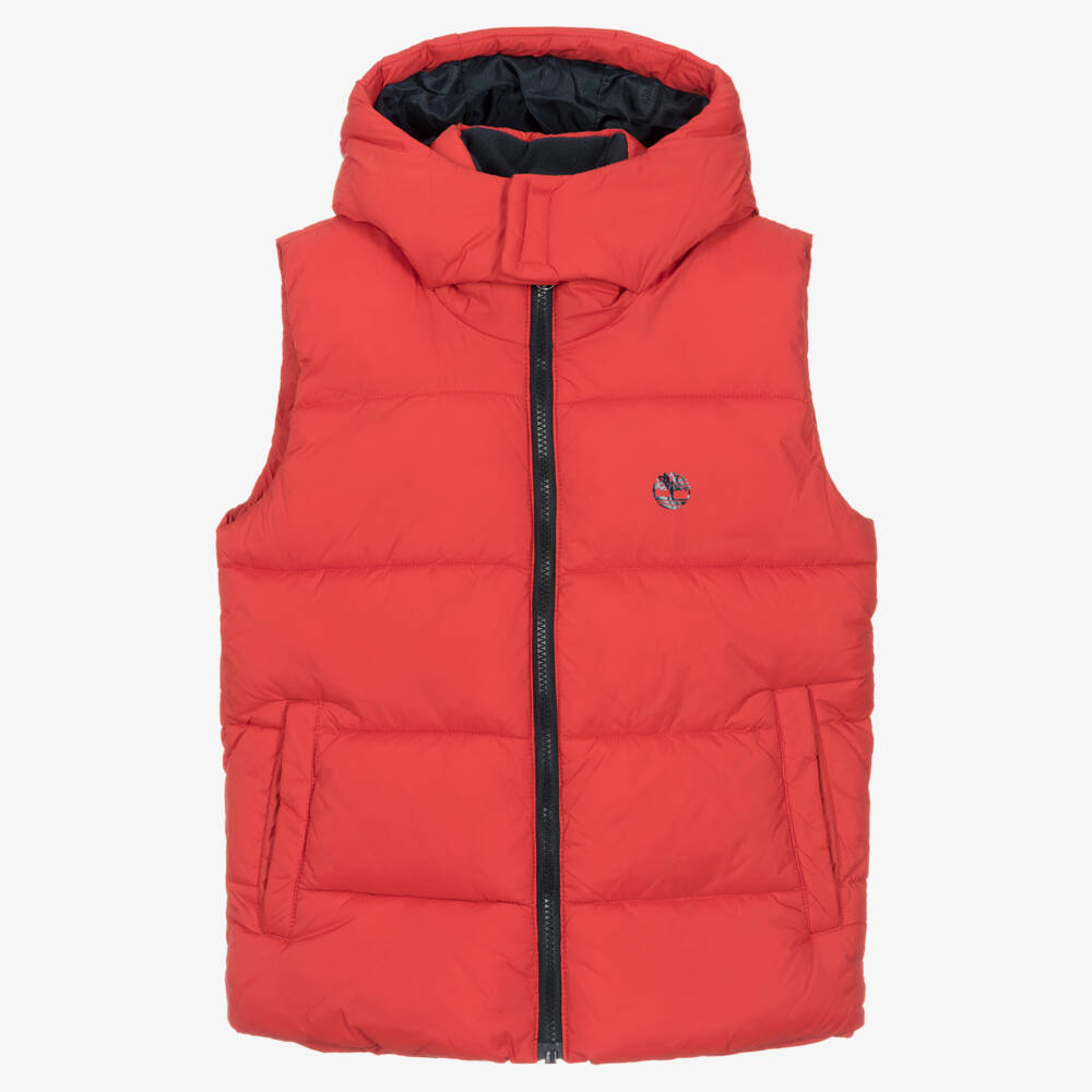 Silky red puffer gilet for teen boys by American brand Timberland, with the iconic tree logo printed on the chest in navy blue and a navy blue, logo-branded satin lining. Water repellent and softly padded for comfort and warmth, it is ideal for cooler days, as well as for layering beneath a jacket or coat. It has a hood secured with velcro under the chin, fleece-lined front pockets and an exposed, navy blue zip fastening that has a useful, protective chin guard. This product contains a majority of recycled polyamide.