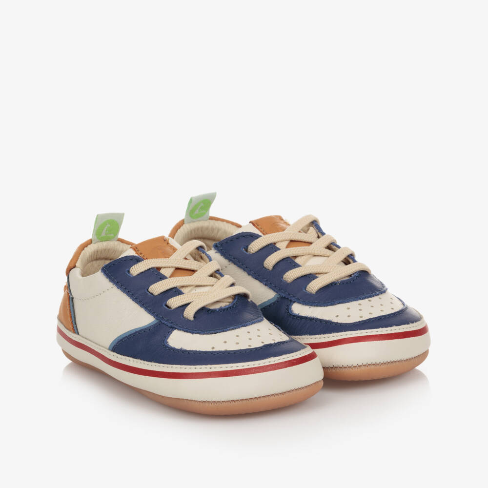 Dark blue and ivory first walker trainers for baby boys and girls by Tip Toey Joey, made from supple leather. Easy to slip-on, they have stretchy faux laces on the toes and an elasticated heel for ease of movement when walking. To support the natural development of growing feet, they are designed with a wider footbed and have a lightly padded insole for comfort. Detailed with tan brown leather trims and a sporty red stripe, they have a flexible non-slip rubber outsole for good grip.