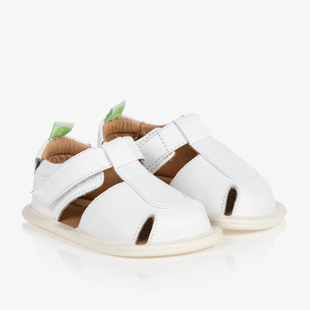 White leather sandals for baby boys and girls by Tip Toey Joey, made from supple leather. Ideal for first walkers, they have a flexible non-slip rubber outsole with an outer ridge for extra stability. They have a wider footbed to support the natural development of growing feet, and an elasticated heel for ease of movement. Lined in soft leather with a lightly padded insole, they fasten with a velcro strap across the front.