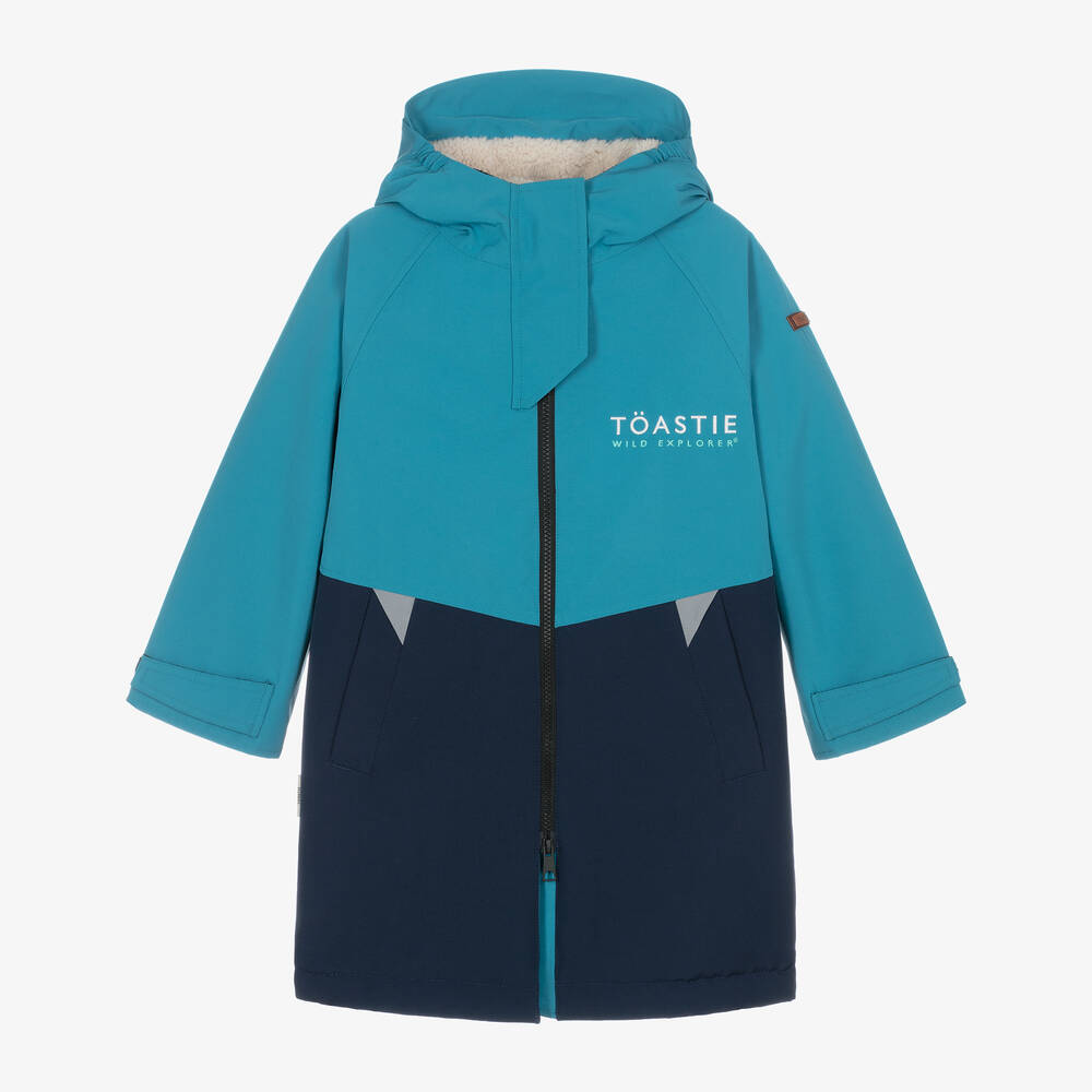 Waterproof two-tone blue raincoat for boys and girls by British brand, Töastie. Designed to withstand the elements, this oversized, thermo-regulating style has a recycled fabric shell and a super soft sherpa fleece lining. The sleeves have adjustable velcro cuffs to adjust around gloves, and the fleece-lined pockets are great for warming hands. Reflective trims improve low-light visibility. Offering comfort for all outdoor activities, this versatile design can also be used as a weather-proof changing robe at the beach.