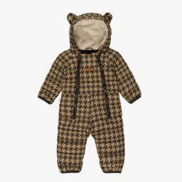 A toffee brown snowsuit for little boys and girls by Töastie, patterned with a stylish black houndstooth pattern. Made in a silky smooth, technical fabric, it is water repellent, breathable with thermo-regulating padding for warmth. The hood has a super soft sherpa fleece lining and cute little bear ears on top for an adorable look. There are fold-over, elasticated cuffs and long, dual zips running along the front to help with dressing.