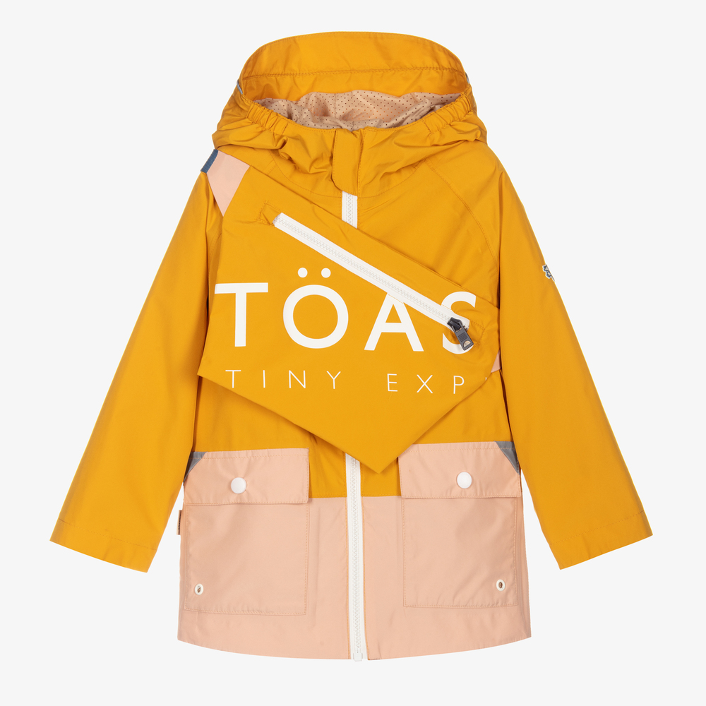 Boys and girls yellow and pink raincoat by British brand Töastie, with a branded fabric belt bag for easy transportation and storage. It is made in high-density polyester from recycled plastic bottles and is PFC-free. It is fully waterproof to 8000mm, with taped seams and light-reflective trims. The hood has a soft peak and the micro-fleece chin guard provides extra warmth. It is lined in breathable polyester Airtex and has popper fastening front pockets. This versatile coat can be worn in summer, or in winter over any other coat, and has a white logo badge on one sleeve.