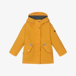 Yellow waterproof raincoat for boys and girls by Töastie, made in sustainably sourced recycled materials from P.E.T plastic bottles. Warm and practical, it has a thermal jersey lining with cosy fleece lined pockets and fastens with a zip. For extra visibility, there are reflective trims.