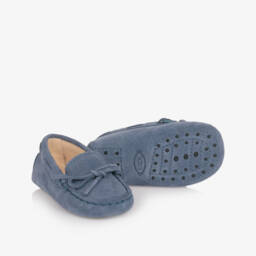 A pair of blue leather moccasin shoes for baby boys and girls, from luxury Italian brand Tod's. These traditionally styled slip-on shoes are handmade in smooth leather with stitch detailing, the brand's signature pebble grips and an embossed monogram logo on the front for a designer finish.