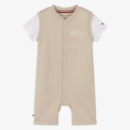 Blue and white striped shortie for baby boys by Tommy Hilfiger, made in soft and stretchy cotton piqué. This cute shortie has a neat collar, short sleeves, and branded buttons on the front, with poppers between the legs for ease of dressing and nappy changes. Cool and comfortable on warmer days, it features a signature flag logo embroidered on the chest and a matching tab on the side of one leg.