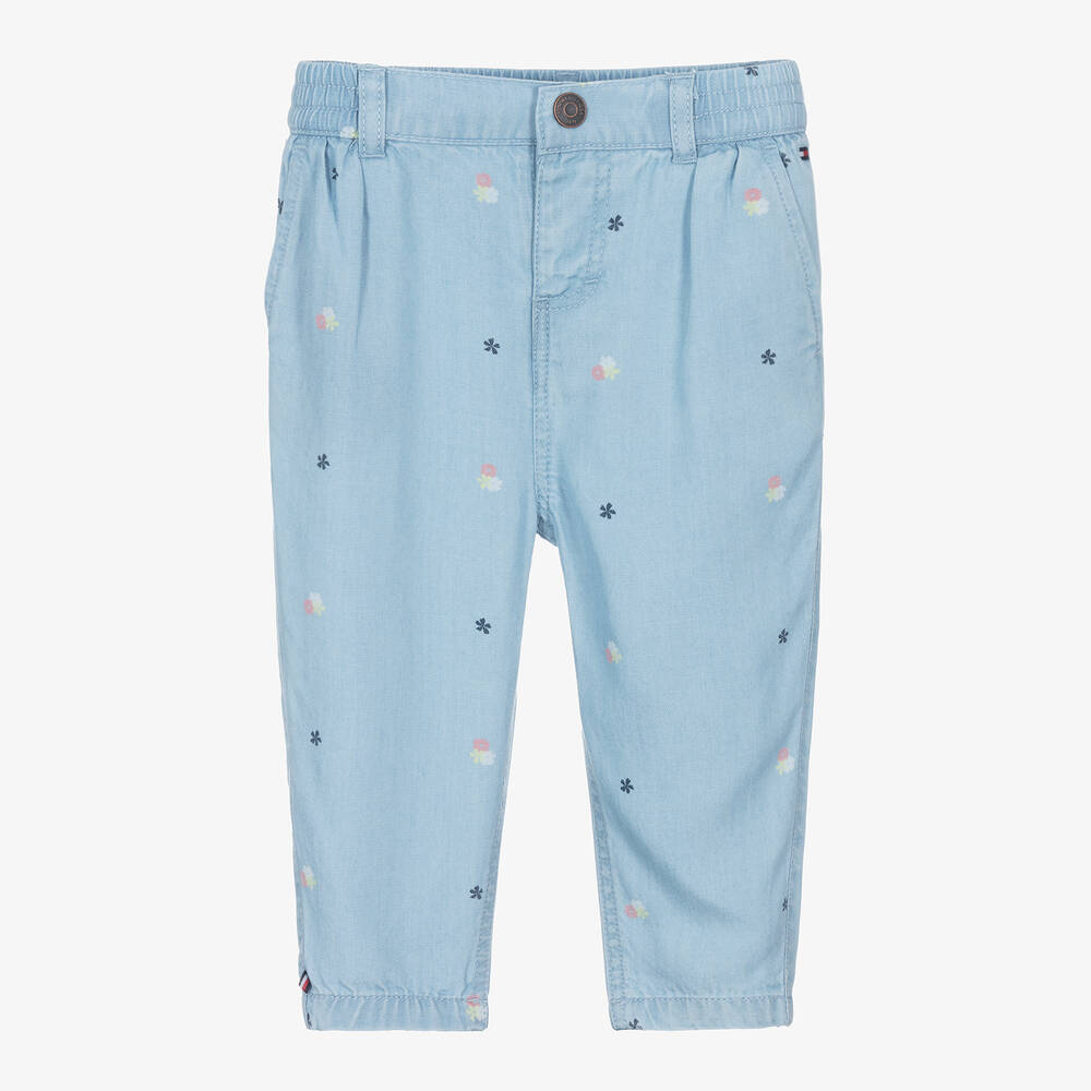 Light blue chambray trousers for baby girls by Tommy Hilfiger, made from lyocell for a beautifully soft and lightweight feel. Easy and comfortable to wear, they have an elasticated waistband with concealed popper fastenings on the front. They have a sweet flower print and iconic flag embroidery on the hip.