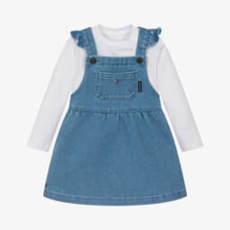Cute cotton dress set for baby girls by Tommy Hilfiger, ideal for relaxed days. The white jersey top is soft and comfortable, with puffed sleeves. The blue denim pinafore dress has stretchy, elasticated shoulder straps with tri-colour trims and side popper fastenings. Both pieces are embroidered with the brand's iconic flag logo.