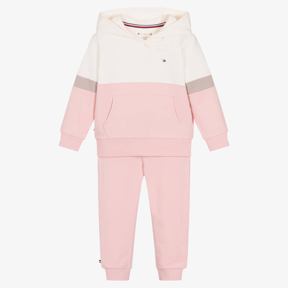 Ivory and pink tracksuit for baby girls by American brand, Tommy Hilfiger. Made in comfortable, lightweight cotton sweatshirt jersey, both pieces have branded details for a discreet designer touch. The hooded top has popper fastenings on the front shoulder and a pouch pocket on the front. The cuffed joggers have a drawstring waist for an adjustable fit, with concealed side pockets and a patch pocket on the back. The cotton in this product is at least 50% organic.