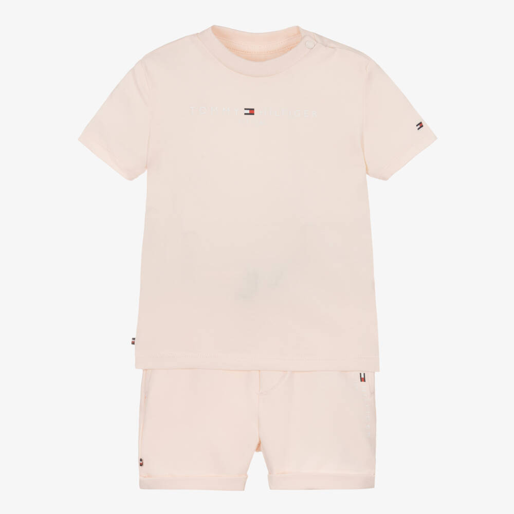 Pale pink top and shorts set for baby girls by Tommy Hilfiger, made in soft and comfy cotton jersey. Both pieces have white logo prints and signature flag logo embroidery. The T-shirt has shoulder poppers to help with dressing, and the shorts have an elasticated waist with a drawstring tie in the brand's recognisable tricolours. The shorts have side seam pockets, with an additional patch pocket on the back.