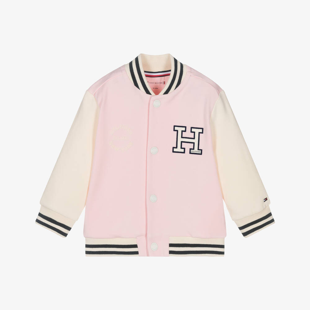 Baby girls pink cotton varsity jacket by Tommy Hilfiger with navy blue striped trims and flocked sporty logos. A lovely layering piece for the warmer months, it is made in soft lightweight jersey, comfortable for baby girls with a grown-up little look.