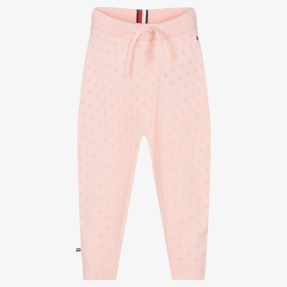Pale pink knitted cotton trousers for baby girls by American brand Tommy Hilfiger, knitted in a feminine, pointelle pattern with subtle, geometric openwork. They have cosy, ribbed trims and a drawstring waist for a comfortable fit. The iconic flag logo is embroidered below the waist, whilst the signature tricolour detailing is both around the back and on one ankle.