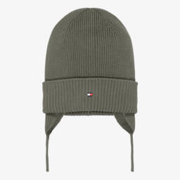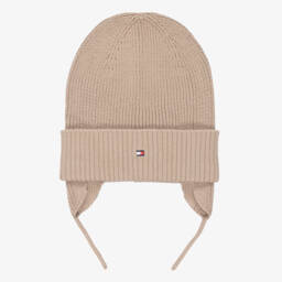 Beige hat for boys and girls by Tommy Hilfiger, offering a practical and stylish option for cooler days. In a soft, ribbed organic cotton knit, the turned-up brim has the brand's iconic flag logo for instant recognition, and there are earflaps for added protection from the elements.