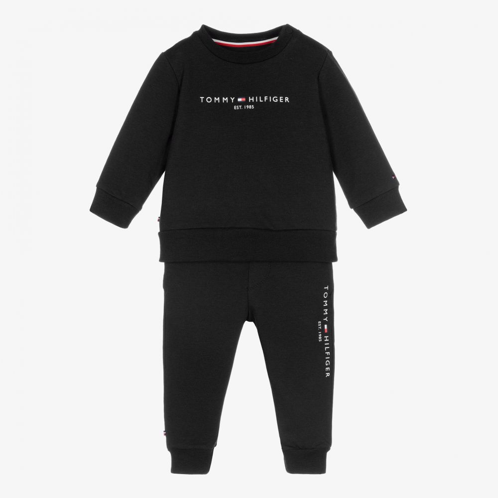 For baby boys and girls, a black organic cotton jersey tracksuit by Tommy Hilfiger. Both the top and bottoms have a white logo print, side seam tab, and embroidered flag. The top fastens with poppers on the shoulder, whilst the bottoms have a comfortable drawstring waist and side pockets.