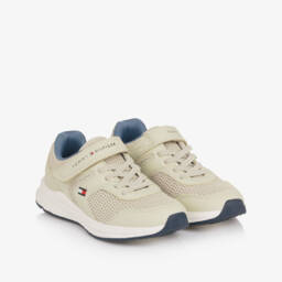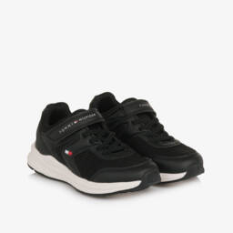 Black mesh trainers for boys and girls by Tommy Hilfiger, with faux leather trims. These stylish trainers have a soft fabric lining and a padded insole for comfort, with a non-slip rubber outsole. They have elasticated laces and a velcro strap for a secure fit, with bold branding on the strap. A small flag logo on the side adds a signature finish.