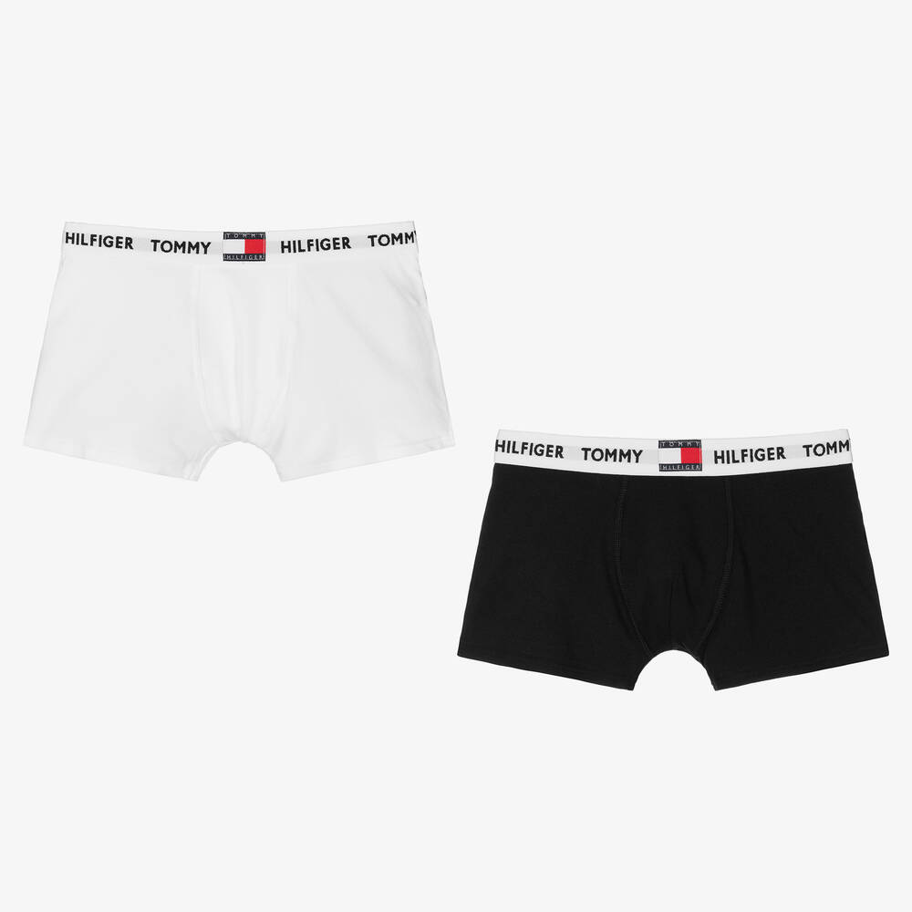 Pack of two boxer shorts for boys in black and white by Tommy Hilfiger, made in a soft and stretchy cotton blend. Stylish and comfortable, both pairs have an elasticated, iconic logo waistband. The cotton in this product is 20% recycled.
