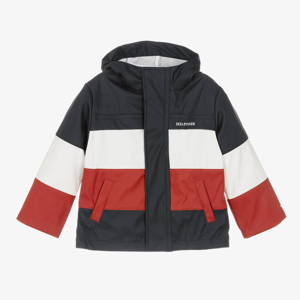 A hooded colourblock jacket for boys and girls by Tommy Hilfiger, designed in the brand's signature red, white and navy blue colourway. This practical design is made using windproof and water resistant technology, with adjustable popper fastening cuffs and a toggle hem for added protection. There are useful pockets on the front and a zip fastening concealed beneath a popper placket. Completing the stylish designer look, a white logo print can be seen on the chest and the signature flag features on one sleeve.