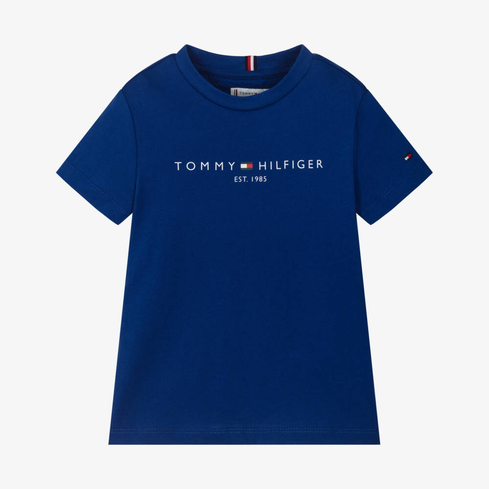 Royal blue T-shirt for boys and girls by Tommy Hilfiger, made in soft cotton jersey. This classic wardrobe staple has a white logo printed on the front, with the signature flag embroidered on one sleeve for a distinctive designer touch.