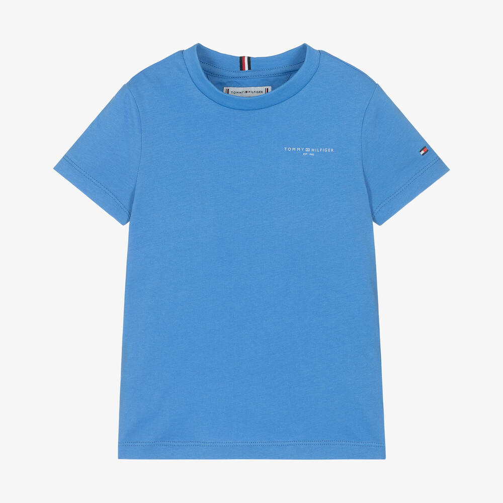 A blue cotton T-shirt for boys and girls from Tommy Hilfiger. An embroidered iconic flag, signature striped trim and a white logo print give this comfortable everyday casual staple a designer touch.