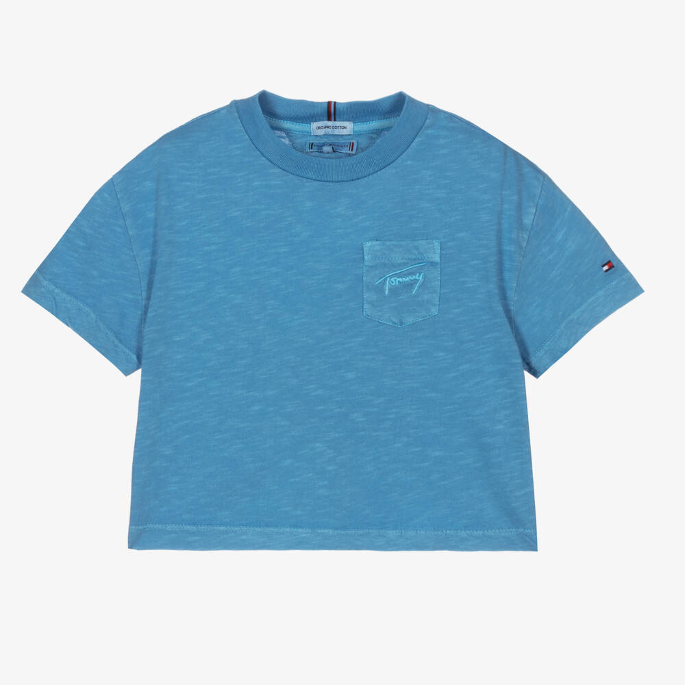 Pale blue T-shirt for girls by American brand Tommy Hilfiger, made in organic cotton slub jersey. It has the designer's signature script style logo embroidered on the chest pocket and the iconic flag logo embroidered on one sleeve. There is signature detailing around the back of the neckline.