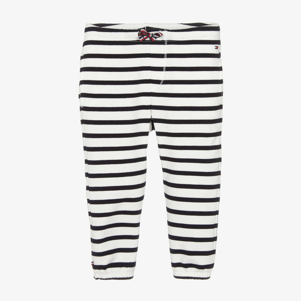Adorable joggers for baby boys and girls from Tommy Hilfiger, in navy blue and white Breton stripes. Made in beautifully soft organic cotton jersey, they have a gently elasticated waist with a tricolour drawstring for a comfortable fit. There are useful concealed side pockets and the brand's signature flag logo is embroidered on the front for a designer finish. This item is made wtih at least 95% organic cotton.