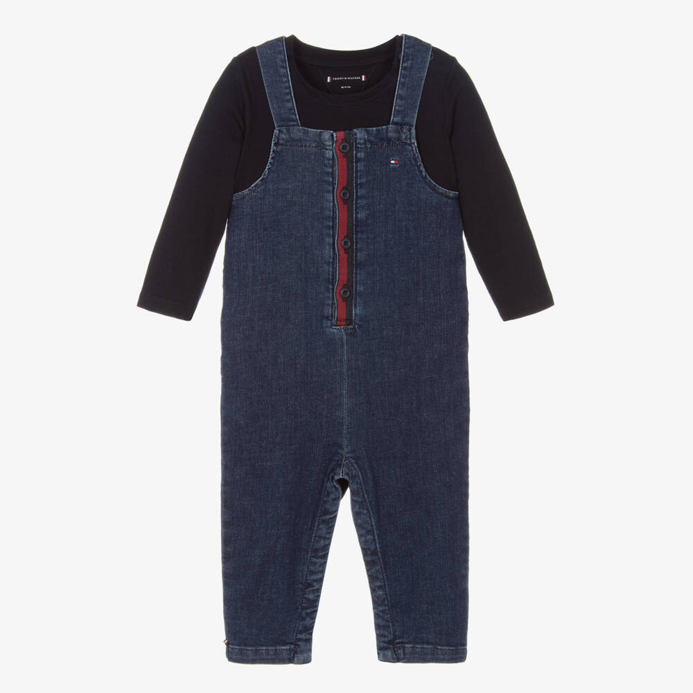 Casual and comfy for baby boys and girls, this top and dungarees set is by Tommy Hilfiger. The navy blue top is made in soft cotton jersey and has easy-fastening poppers on one shoulder. In comfortable stretch denim, the blue dungarees have global stripe detailing on the front button placket, with sweet patch pockets on the back. Both pieces are embroidered with flag logos for a designer finish. This product is made with at least 20% recycled cotton.