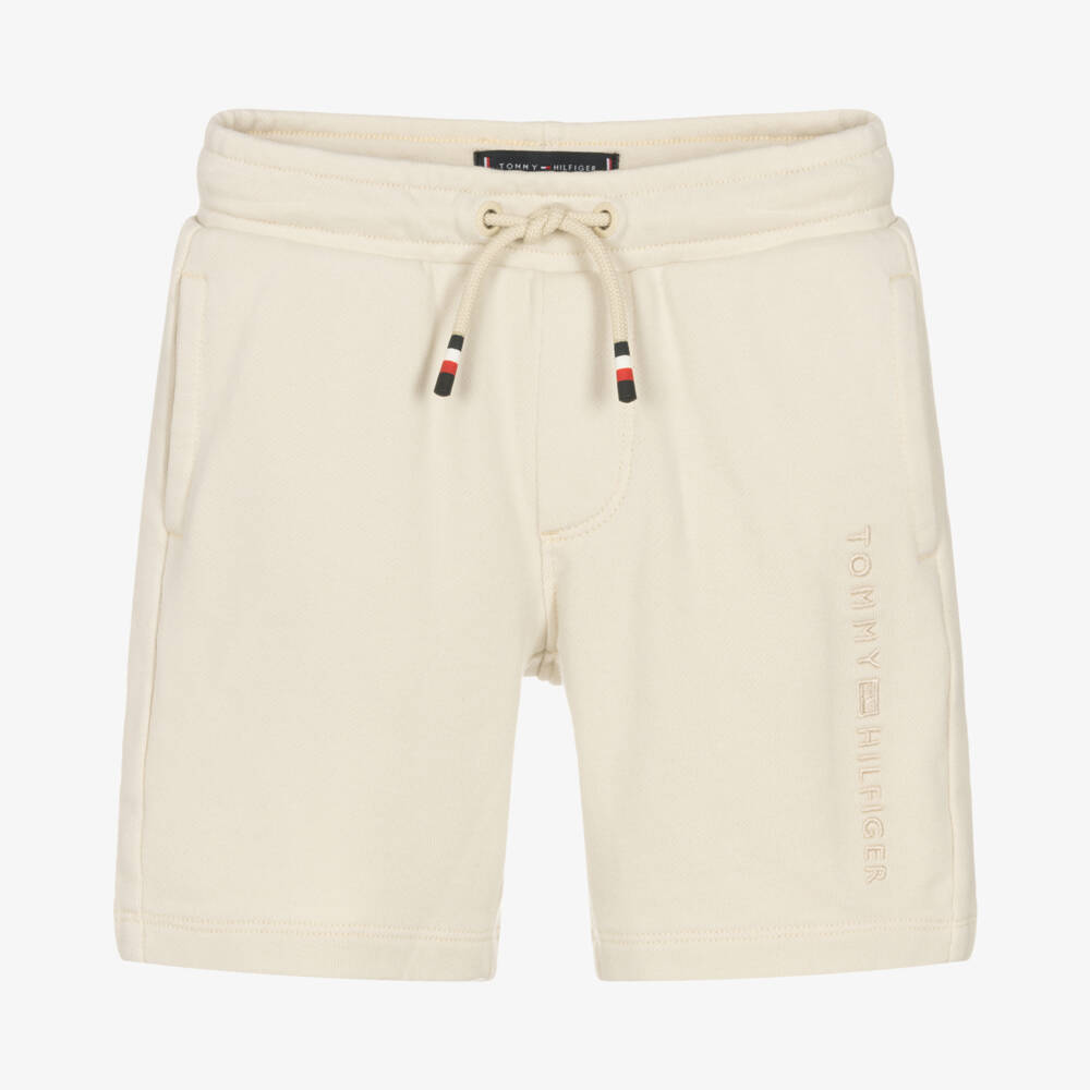 Casual beige shorts for boys by Tommy Hilfiger, great for relaxed lounging. Made in soft cotton jersey, they have a tonal logo embroidery on one leg and tricolour striped drawstrings. There are slanted pockets on the front and a singular pouch pocket on the back, embroidered with the iconic flag logo for a branded finish.