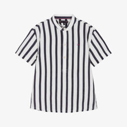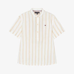 Ivory and beige shirt for boys by Tommy Hilfiger, made in a lightweight linen and cotton blend. Whether it's a summer wedding or a relaxed afternoon with family, the short sleeves and neat buttoned placket give it a classic look that works for so many occasions.