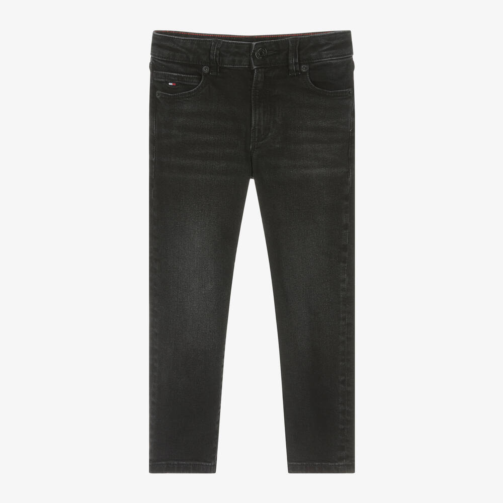 Washed black jeans for boys by Tommy Hilfiger, made in soft stretch denim. With classic five pocket styling, these straight fit jeans feature iconic flag logo embroidery and a logo jacron on the back for a subtle designer statement. They fasten with a zip and branded popper and have a useful adjustable waist. This item contains at least 20% recycled cotton.