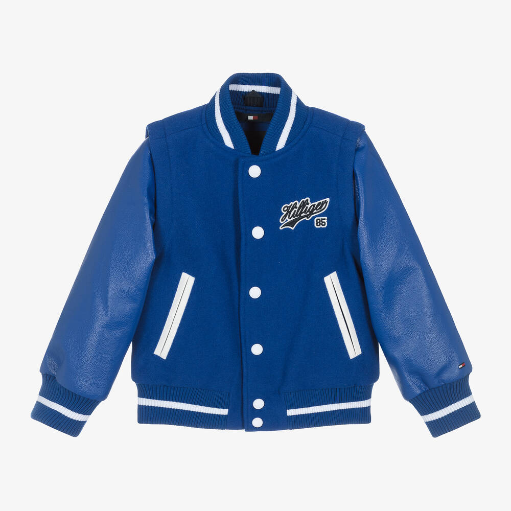 Cobalt blue bomber jacket for boys by American brand Tommy Hilfiger. This varsity-inspired design has script logo patches on the front and back, signature flag embroidery on one sleeve, and contrasting white trims. The jacket is made in a soft wool blend, with removable zip-off faux leather sleeves to create a gilet. There are branded popper fastenings and slanted front pockets.