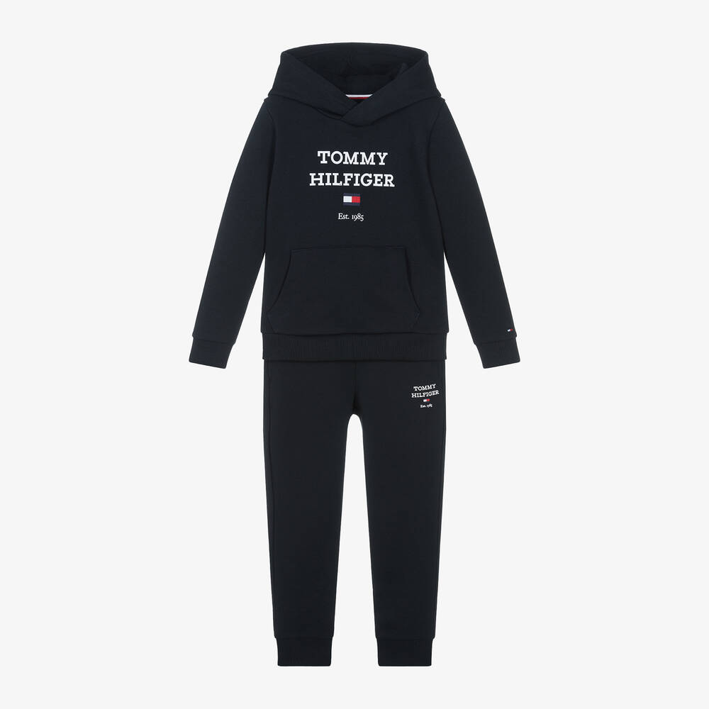Navy blue hooded tracksuit for boys by Tommy Hilfiger. Casual and comfortable, it is made in mid-weight cotton-blend jersey, with ribbed trims. Both pieces are printed with signature logo branding and have the designer's iconic flag embroidery. The top has a sporty pouch pocket on the front and signature striped detailing on the inside neckline. The joggers have a drawstring waist for an ideal fit, with three useful pockets.