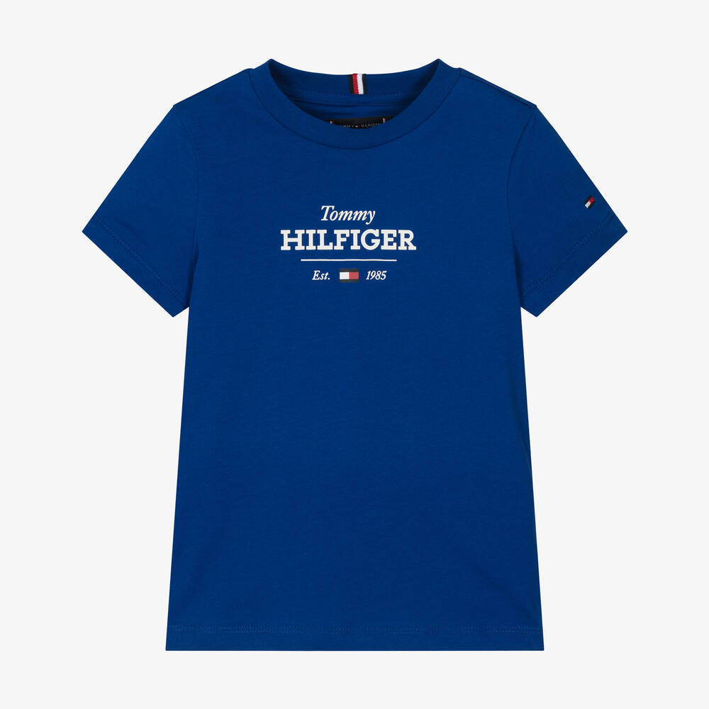 Classic blue cotton T-shirt for boys by Tommy Hilfiger, made in soft, comfortable jersey. To add a little designer style to casual days, it has white logo, tricolour stripes and signature flag detailing.