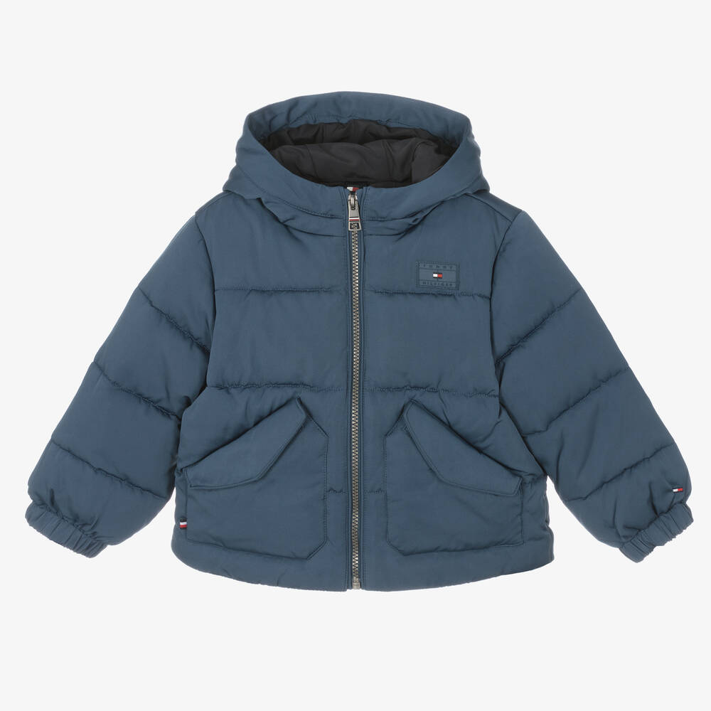 A cosy hooded puffer jacket for boys by Tommy Hilfiger, in a lovely shade of blue. Made from recycled materials, it is silky smooth and warmly padded, with an embroidered logo patch on the chest and the American brand's monotype logo embroidery across the hood. It fastens with a robust zip and has practical front pockets with popper flaps, an internal velcro pocket, and elasticated cuffs to lock in warmth. The signature flag logo is embroidered on one sleeve and a tricolour tab trims the front pocket for a designer finishing touch.