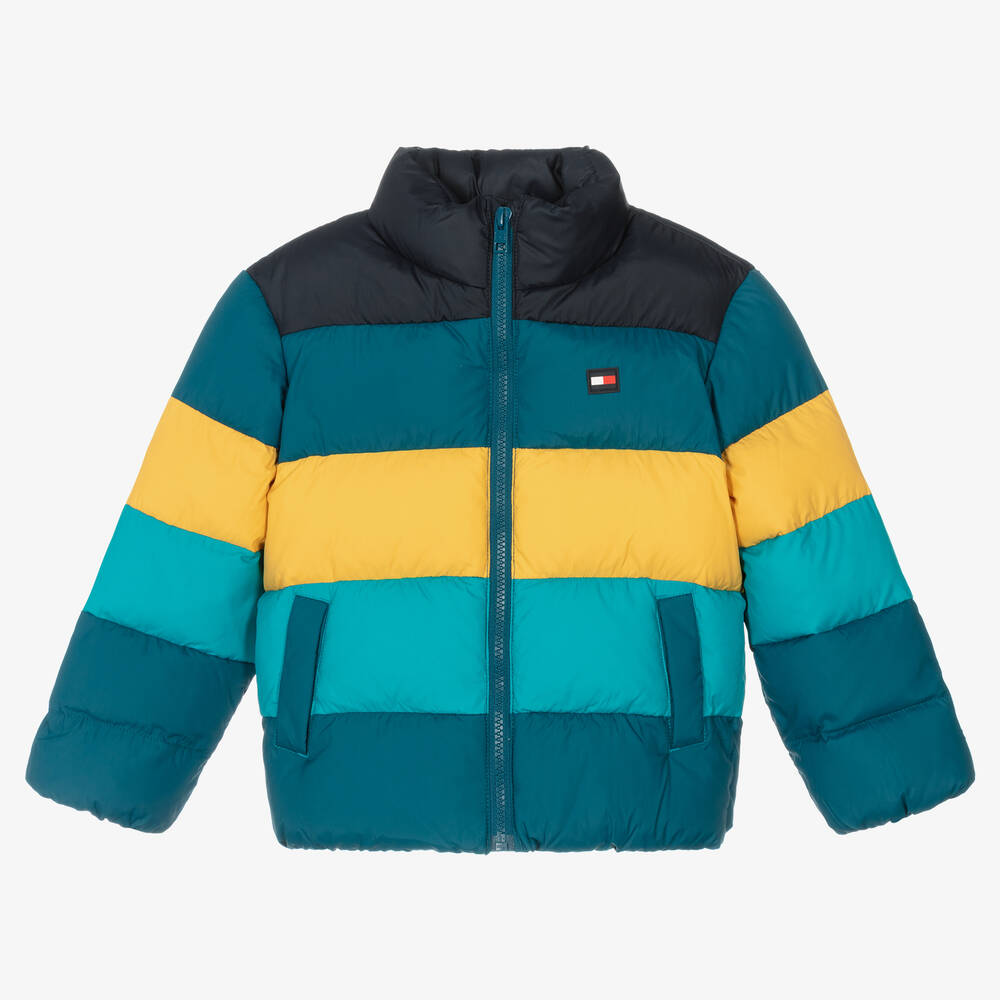 Teal blue and yellow striped puffer jacket for boys by American brand Tommy Hilfiger, made in soft and smooth fabric. It has fleece lined pockets and warm technical Sorona® padding. The designer's signature flag logo contrasts against the horizontal colour block design, whilst white lettering on the inner zip trim adds another subtle branded touch. This item contains at least 50% recycled fibres.