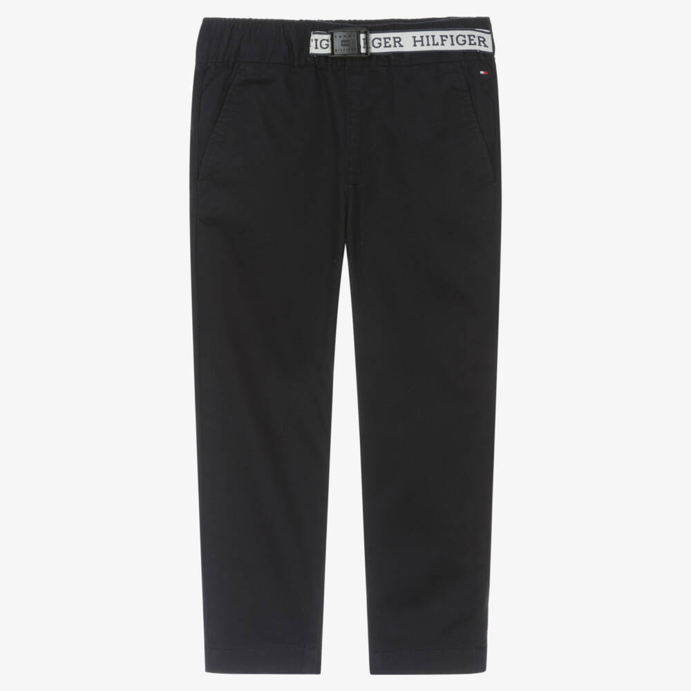 Navy blue trousers for boys by Tommy Hilfiger, woven in soft cotton-blend twill. This smart-casual style has the iconic flag logo embroidered on one pocket and a cool, contemporary belt-style waist.