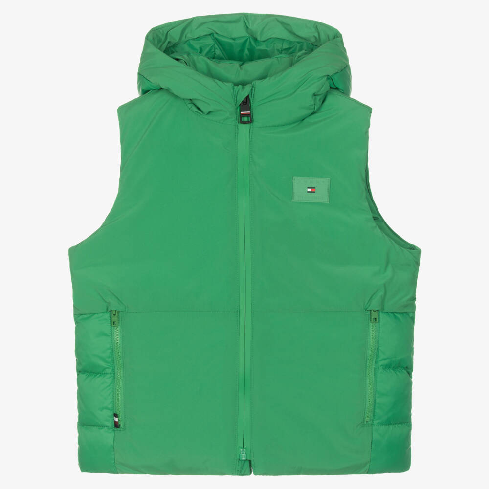 Bright green padded gilet for boys by American brand, Tommy Hilfiger. Great for layering on colder days, it has a matte logo patch on the chest with the brand's iconic tricolour flag. It fastens with a smooth taped zip on the front and has fleece-lined pockets to keep hands cosy.