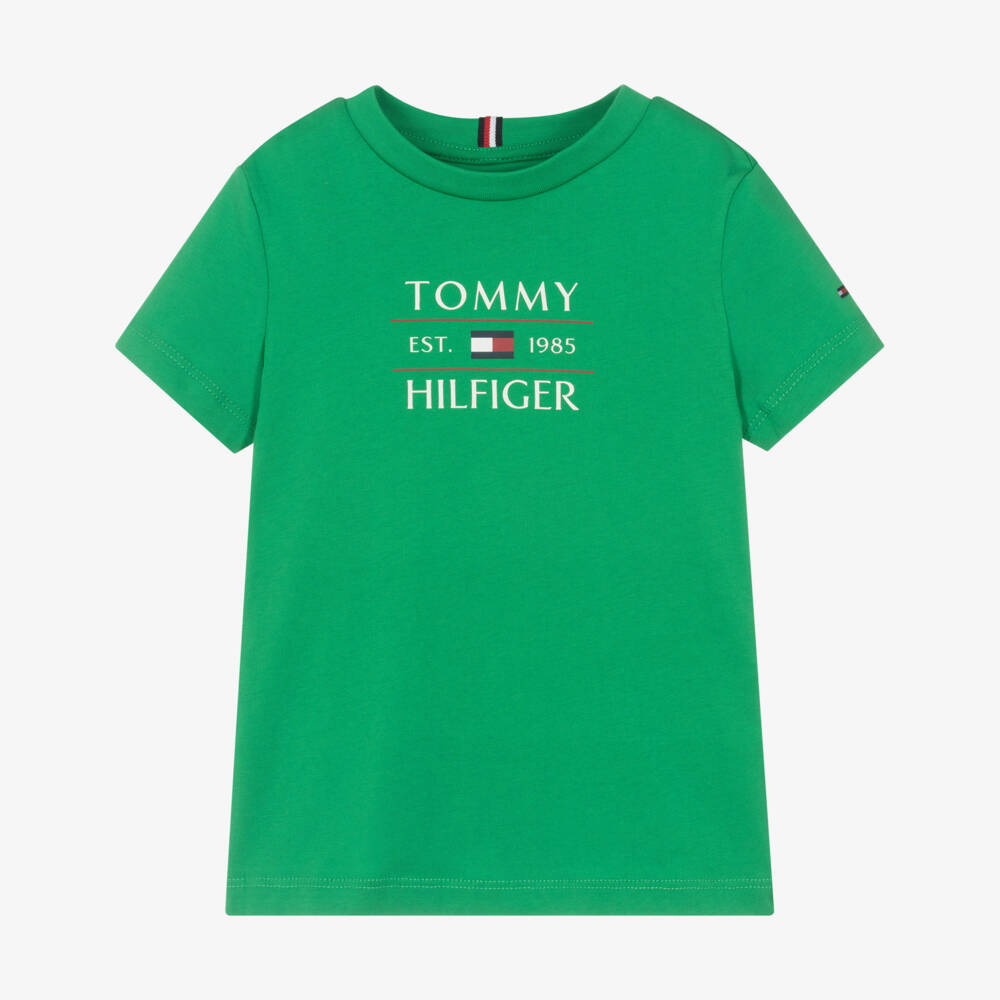 Boys green flag logo T-shirt by Tommy Hilfiger, offering a stylish casual look with its iconic design printed on the front. Made from soft organic cotton jersey, the classic crew neck and short sleeves ensure comfort for everyday wear.
