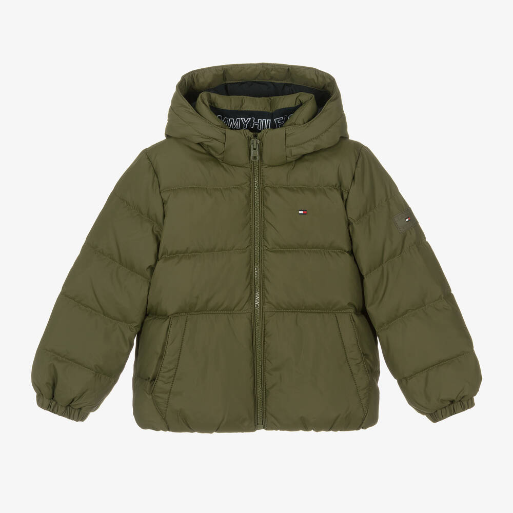 Boys khaki green puffer jacket by Tommy Hilfiger, made in silky smooth, recycled fabric with flag embroidery on the chest. With a practical front zip fastening, this outerwear piece is fully lined and luxuriously padded with down for warmth without the weight. In drier seasons, it has a detachable hood which is easily removed and reattached to the neckline with poppers. The cuffs are gently elasticated to lock in heat and the soft, fleece-lined collar is embroidered with recognisable logo lettering. A logo patch adds branding to one sleeve and the popper pockets provide a safe space for everyday essentials.