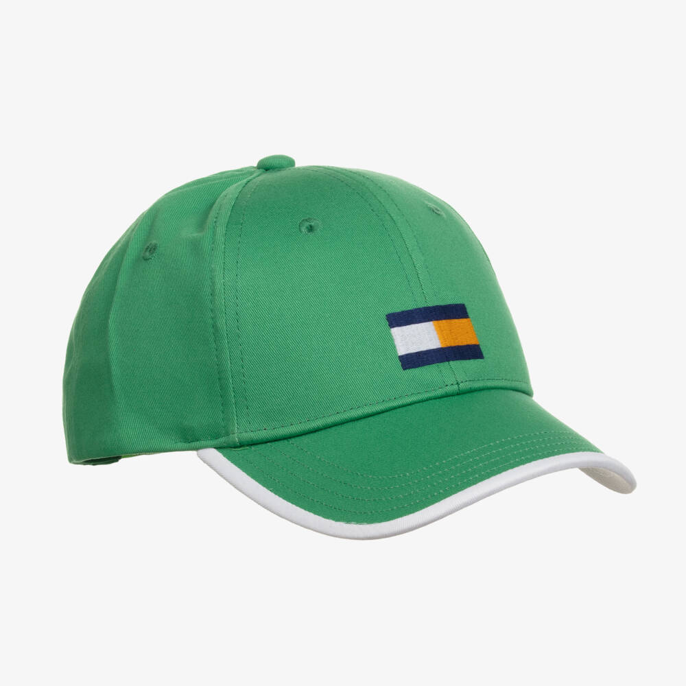 A green cap for boys from Tommy Hilfiger. It is made in soft cotton twill, with a peak to help protect eyes from the sun and an adjustable strap for a great fit. The front is trimmed with white piping and embroidered with the brand's flag logo for instant designer awareness. This item is made with at least 95% organic cotton.